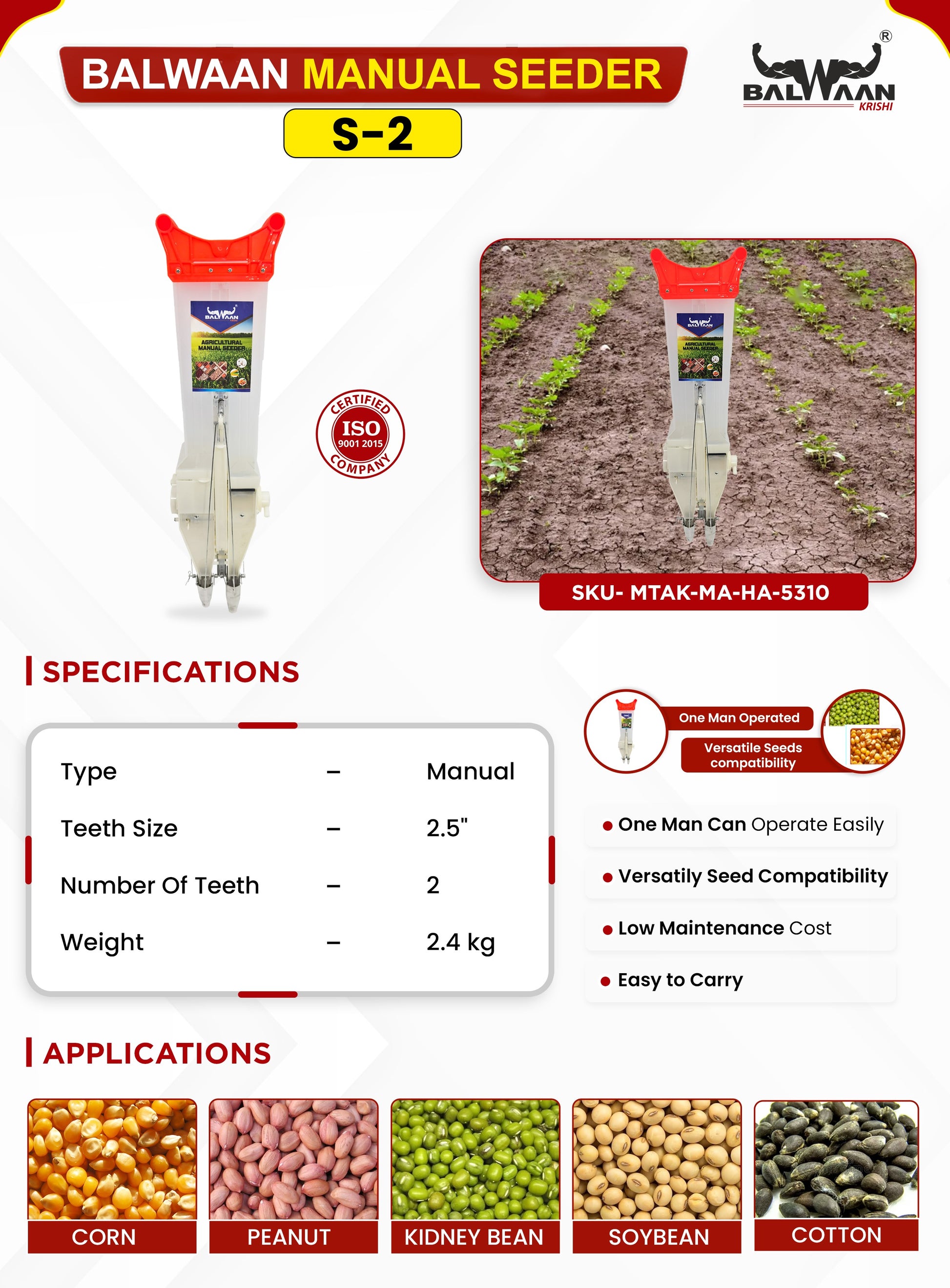 Balwaan manual seeder is suitable for cultivated soil, especially sandy soil, and suitable for seeds like wheat, corn, peanut, beans, cotton, etc. It can be used for sowing and applying fertilizers. A person can sow 8000-1000 m2 seeds with a seeder per day. The efficiency is 4-5 times more than manual seeding. Sowing seeds with our machine according to season and time will decrease the sowing time and enhance the output, especially in hilly areas where big machines cannot be used. Just place it in the exact position and you will get the exact seeder count as required. The seeder drum is completely removable for cleaning and troubleshooting. Lightweight & Eco-friendly. Double barrel assembly makes planting seeds & Fertilizers Quick. Adjustable planting pattern ensures accurate plantation at the assigned location. Overall, the Balwaan Agricultural Manual Seeder S-2 is a valuable tool for farmers, especially those with limited resources, as it is cost-effective, easy to operate, and versatile.