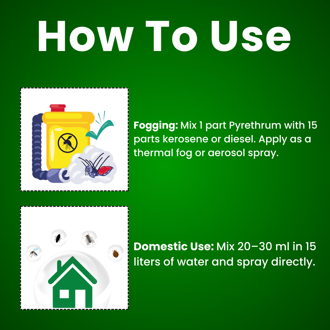 - For Fogging: Dilute Pyrethrum Extract 2% with kerosene or diesel at a 1:15 ratio. It can be applied as a Thermal fog or Ultra fog-low volume aerosol spray.