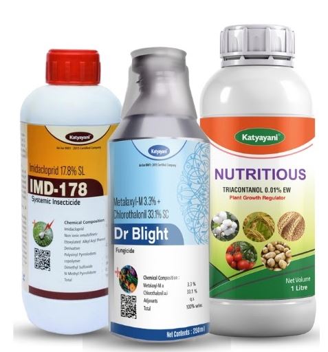 IMD 178 (Imidaclopride 17.8% SL) - 100mlx1, Dr. Blight (Metalaxyl-M 3.3% + Chlorothalonil 33.1% SC) - 250mlx2, Nutritious (Triacontanol 0.1% EW) - 250mlx1